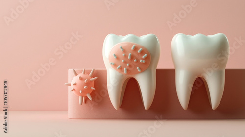Two stylized model teeth on a pink surface, one with bacteria depiction, illustrating dental hygiene and tooth decay.