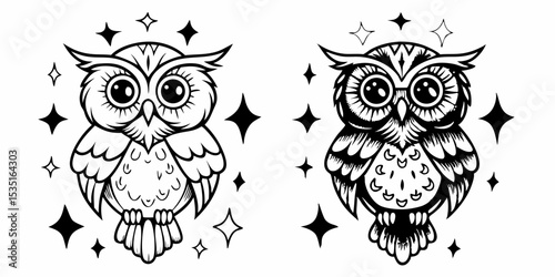 Two stylized owls surrounded by stars in black and white line art illustration style design | eps vectors silhouette