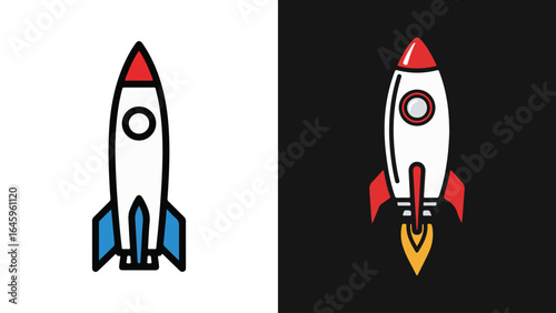 Two stylized rocket illustrations, one on a white background with blue fins and one on a black background with red fins and a flame, representing launch and technology.