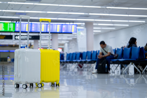 Two suitcases in an empty airport hall, traveler cases in the departure airport terminal waiting for the area, vacation concept, blank space for text message or design, travel.