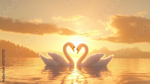 Two Swans Forming Heart Shape At Sunset