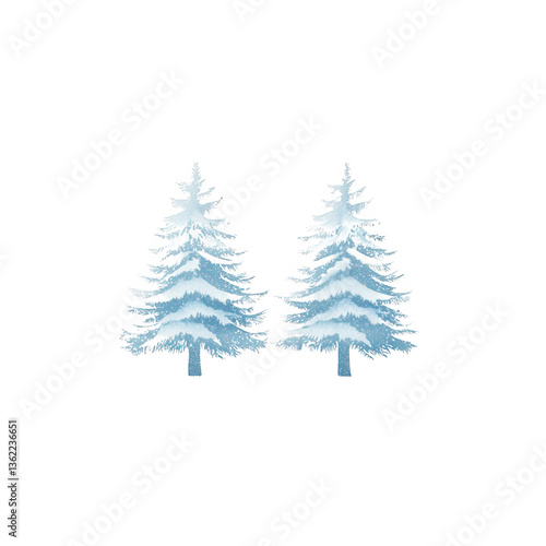 Two tall, snow-covered evergreen trees stand side by side against a white background. The branches are lush and full, showcasing the beauty of winter foliage.