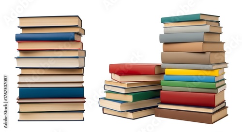 Two tall stacks of colorful hardcover books arranged on a white background for educational or library concepts