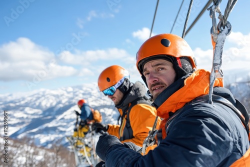Two thrill-seeking friends on a mountain zip line ride, showcasing excitement and adventure against the stunning backdrop of snow-capped mountains and blue skies.