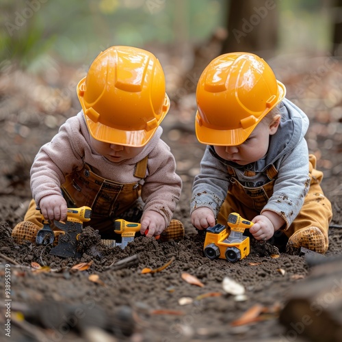 Two toddlers wear orange hard hats and dig in the dirt with toy trucks in a woodland environment