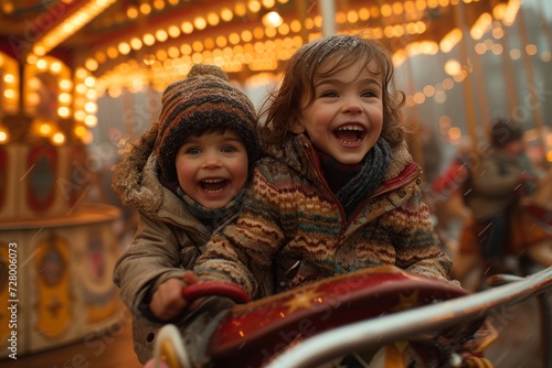 Two toddlers, with beaming smiles on their human faces, dressed in bright clothing, enjoying a carefree ride on the carousel at the amusement park