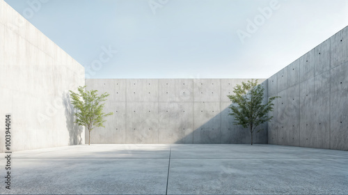 Two trees growing in empty concrete courtyard