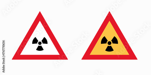 Two triangular warning signs depicting a radiation symbol, one sign has a red border and, while the other has a yellow background