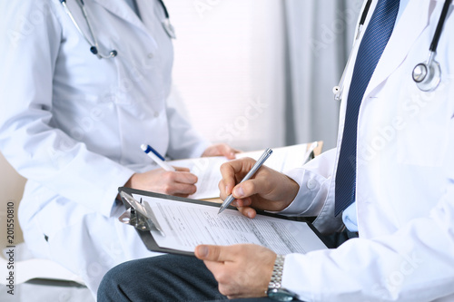 Two unknown doctors filling up medical form on clipboard, just hands closeup. Physicians asking question to patient or discussing medication program. Healthcare, insurance and medicine concept