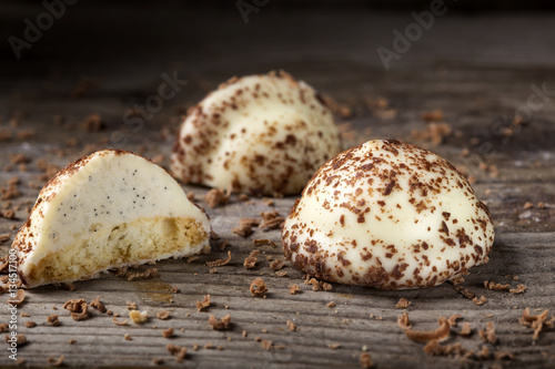 Two vanilla pearl candy, one cut in half, and grated dark chocol