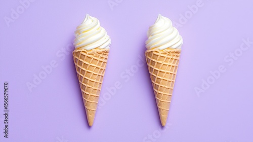 Two Vanilla Soft Serve Ice Cream Cones on Lavender Background
