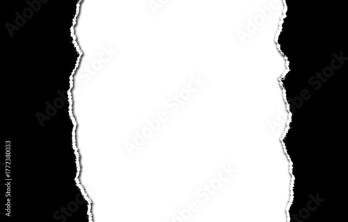 Two vertical rough torn paper edges with white textured borders against a stark black background creating a dramatic abstract visual effect