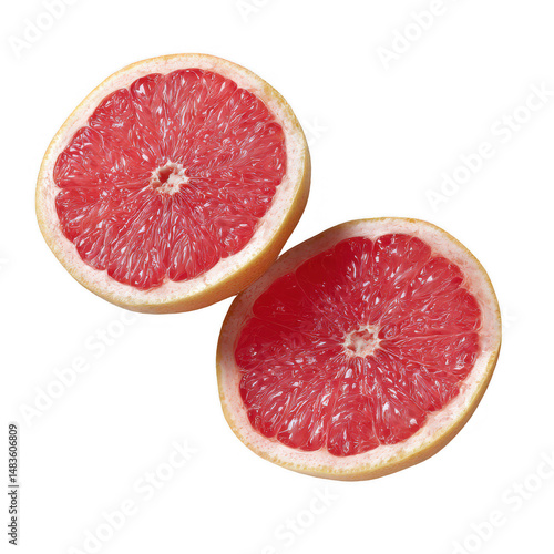 Two vibrant grapefruit halves with juicy red pulp are isolated on a clean white background, showcasing their freshness and citrusy appeal for a healthy treat.