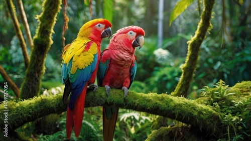 Two vibrant parrots perched on a mossy branch in a lush rainforest setting.