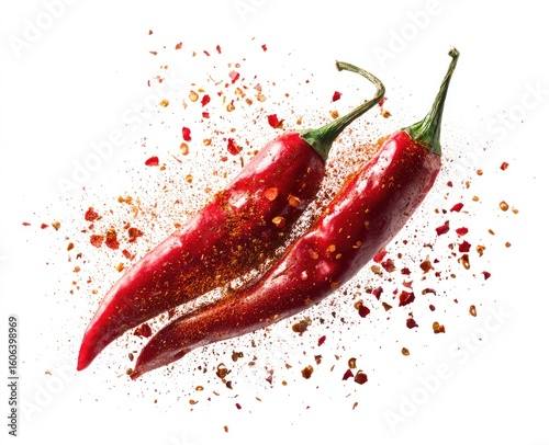 Two vibrant red chili peppers, suspended in a burst of their own ground spice, against a stark white background