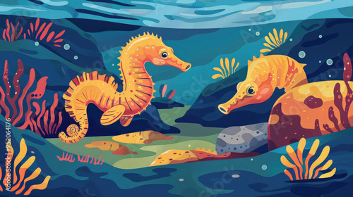 Two vibrant seahorses swim gracefully through a lively coral reef filled with colorful marine plants
