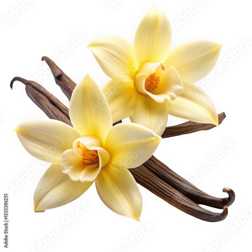 Two vibrant yellow vanilla flowers with pods, symbolizing sweetness and natural beauty.