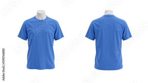 Two views of a periwinkle blue t-shirt displayed on mannequins with isolated transparent backdrop