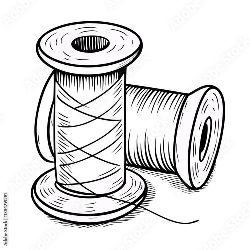 Two Vintage Spools of Thread in Black and White Sketch Style