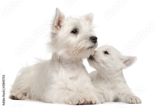 Two West Highland Terrier puppies, 4 months old and 7 weeks old,