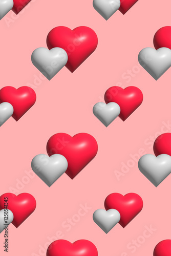 Two white and red hearts on a beige background. Valentine's day and love concept. Mother day. 3D illustration