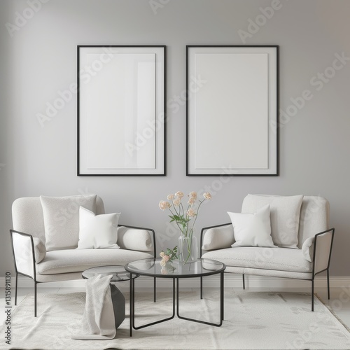 Two white armchairs. a glass coffee table. and a vase of flowers in front of two blank frames on a gray wall