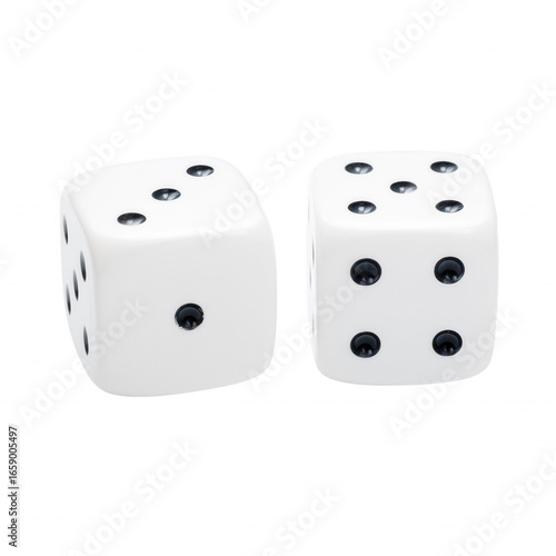 Two white dice with black dots showing three and four on transparent background