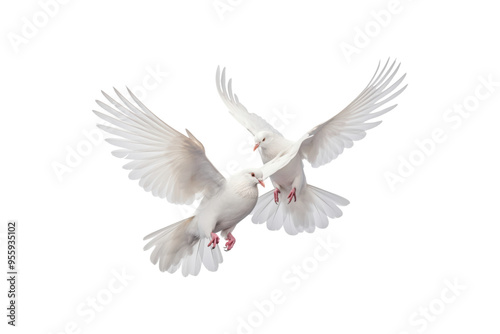 Two white doves are in flight, symbolizing peace and freedom. Great for logos, backgrounds, or designs promoting peace and unity