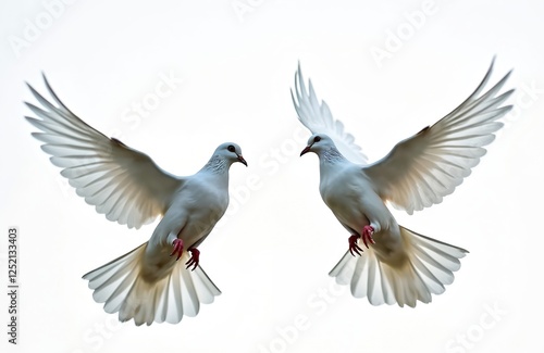Two white doves fly with spread wings. Pigeons isolated on clear background, symbolise love, peace. Flying bird couple for wedding card, romantic design. Gentle fauna.