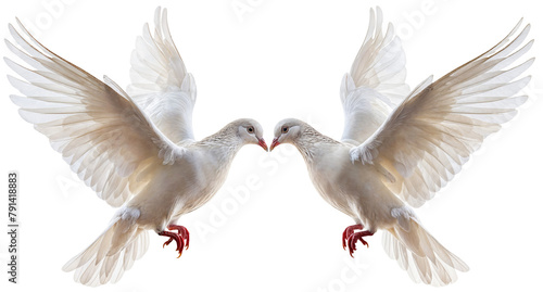 Two white doves flying face to face as a symbol for love and wedding, isolated on a transparent background