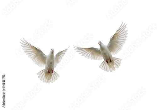 Two white doves flying with wings spread against a stark white background in a minimalist composition