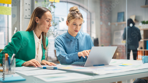 Two White Females Have a Discussion in Meeting Room Behind Glass Walls in an Agency. Creative Director and Project Manager Compare Business Results and App Designs on Laptop in an Office