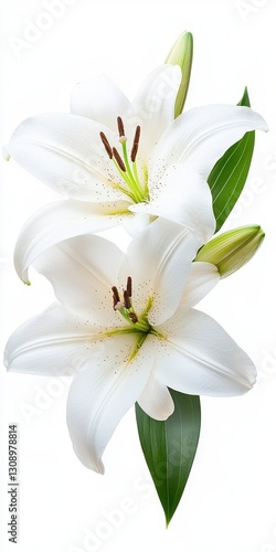 Two White Lilies with Green Leaves on White Background