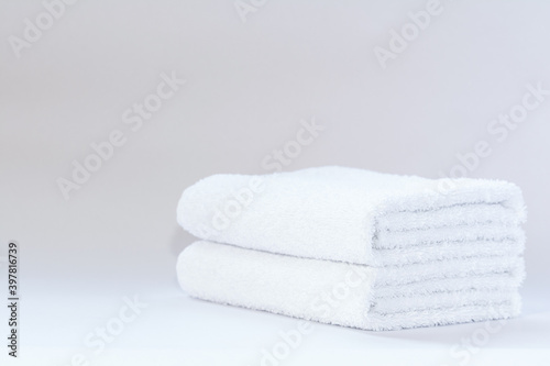 Two white neatly folded terry towels on a light background.