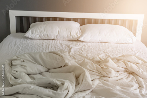 Two white pillow on bed with wrinkle messy blanket in bedroom
