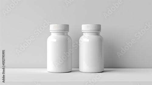 Two white plastic bottles with lids, on a plain white background. They are perfect for your branding or mockup design.