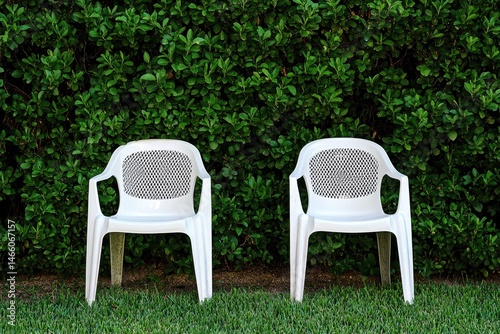 Two white plastic chairs facing forward, positioned side-by-side in a grassy area A dense hedge of green shrubs forms a backdrop