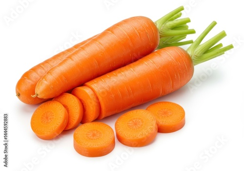 Two whole carrots with green stems and several carrot slices on a white background surface view