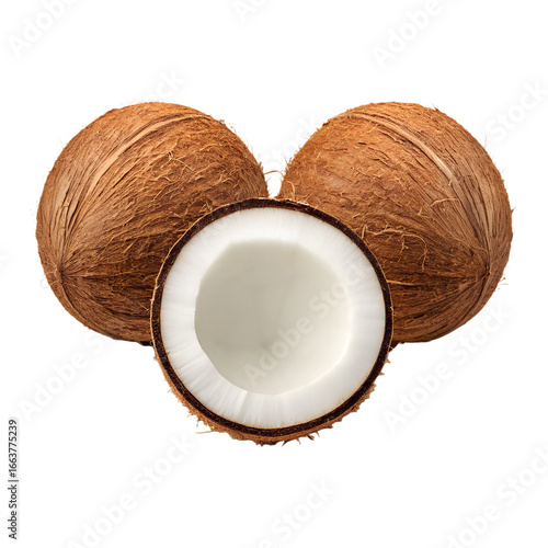 Two whole coconuts and one half coconut showing white flesh isolated on transparent background