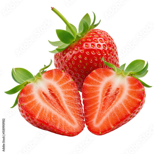 Two whole, fresh, ripe red strawberries, one cut in half showcasing juicy red interior and yellow achenes, isolated on transparent background with copy space, perfect commercial food advertising