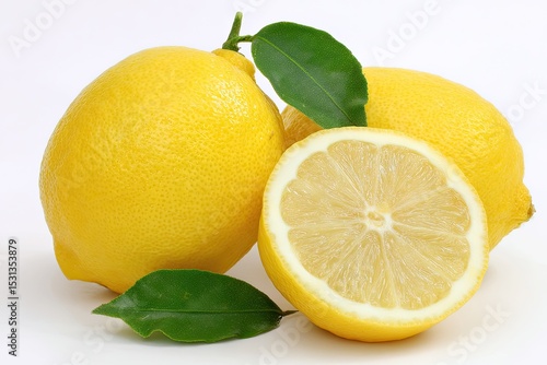 Two whole lemons and a lemon half, bright yellow, with fresh green leaves