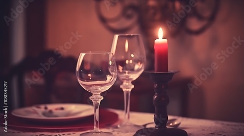 Two Wine Glasses and a Lit Candle on a Tabletop