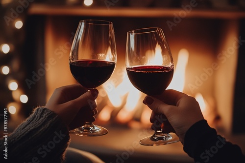 Two wine glasses clink together in front of a cozy fireplace, creating a warm atmosphere for an intimate evening.