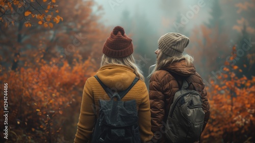 Two women backpacking in a forest, surrounded by trees and natural landscape
