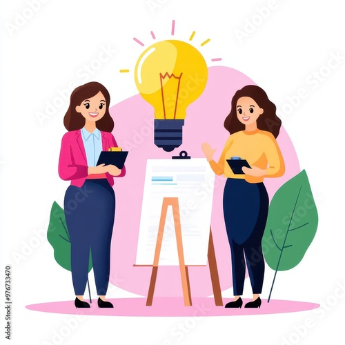 Two women discussing ideas with a light bulb above, symbolizing creativity and collaboration in a professional setting.