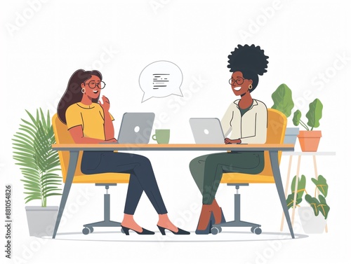 Two Women Engaged in a Friendly Conversation at a Modern Office Workspace