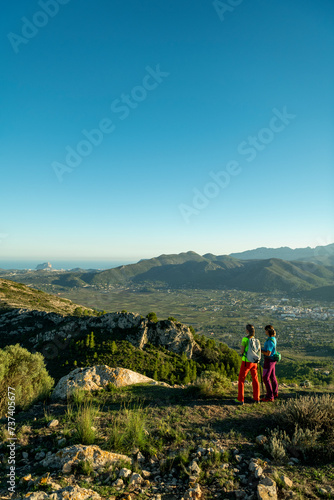 Two women hikers enjoying the beautiful nature from high above, Lliber, Alicante, Costa Blanca, Spain - stock photo