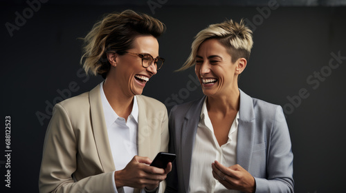 Two women in suits are actively discussing work while looking at a tablet and phone in the office