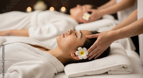 Two women receiving head massages at a spa with white flowers and robes in a serene environment