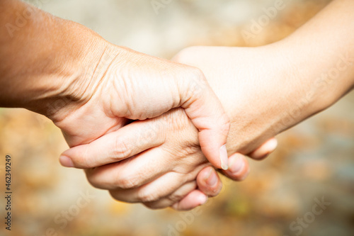 Two women shaking hands outdoors. Team work and agreement setting concept. Women solidarity and support. Caucasian palm. Strength and collaboration. fingers with blurred background. Make business